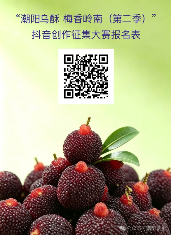 2.参与方式:参赛对象需在抖音平台公开发布原创作品,发布时必须带上指定话题:#潮阳乌酥梅香岭南第二季,要求将指定话题按照顺序置于首位,其他自拟话题添加在其后面,未带指定话题的作品不纳入评选范围,同时扫描问卷星二维码填写报名表。