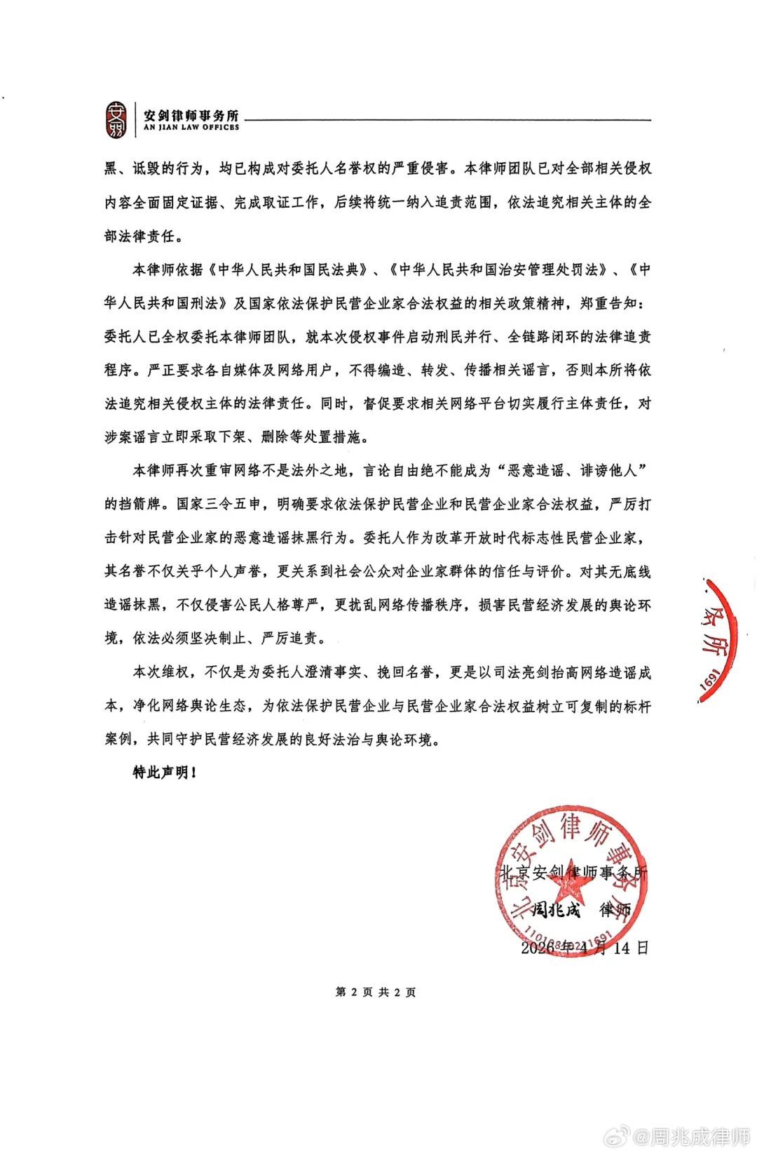 4月14日,王石独家全权委托律师周兆成,就近期全网发酵的针对王石先生的恶意造谣诽谤事件,正式面向全社会发声。