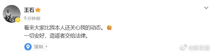 随后,王石微博发声:“看来大家比我本人还关心我的动态。一切安好,造谣者交给法律。”