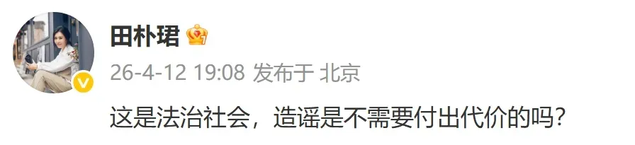 12日傍晚,王石妻子田朴珺发文辟谣,“这是法治社会,造谣是不需要付出代价的吗? ”