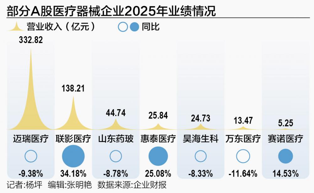 较典型的如赛诺医疗,公司2025年实现营业总收入5.25亿元,同比增长14.53%;归属于上市公司股东的净利润4728.63万元,同比大幅增长3057.07%,是目前已披露年报中业绩增幅最大的医疗器械企业。